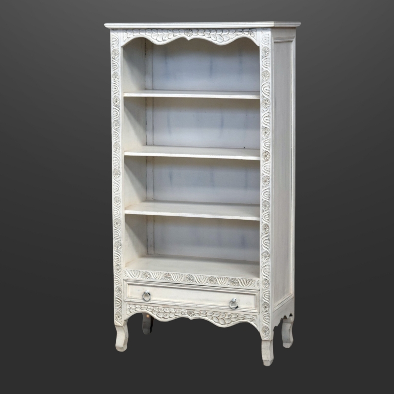 Elevate your interior with the vintage charm of the KAP-2010 bookshelf. Beautifully hand-carved and finished in a distressed antique white, this elegant piece draws inspiration from classic French provincial design. Delicate leaf motifs and scalloped edges add a touch of grace, making it a refined statement in any room.