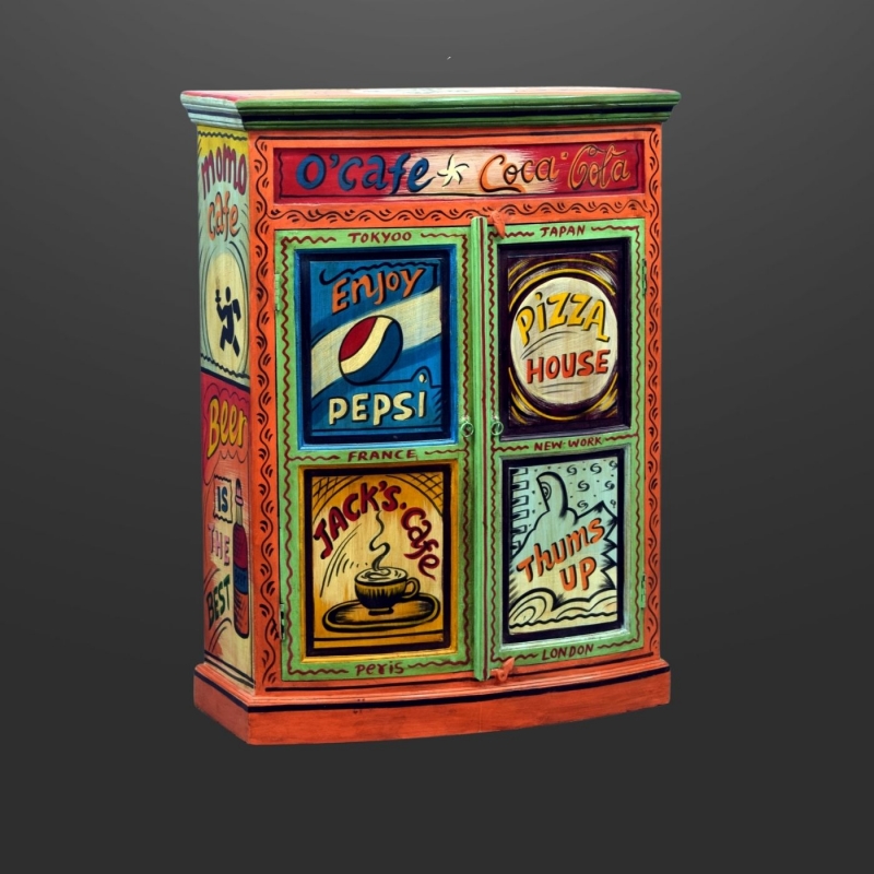 Celebrate retro nostalgia with this café-themed hand-painted cabinet, Model KAP-1252. This vibrant piece showcases bold pop-art style with iconic imagery like “Enjoy Pepsi,” “Pizza House,” “Jack’s Cafe,” and “Thumbs Up” – each panel telling its own quirky story. Perfect for eclectic and fun spaces, this cabinet blends street art vibes with café culture.