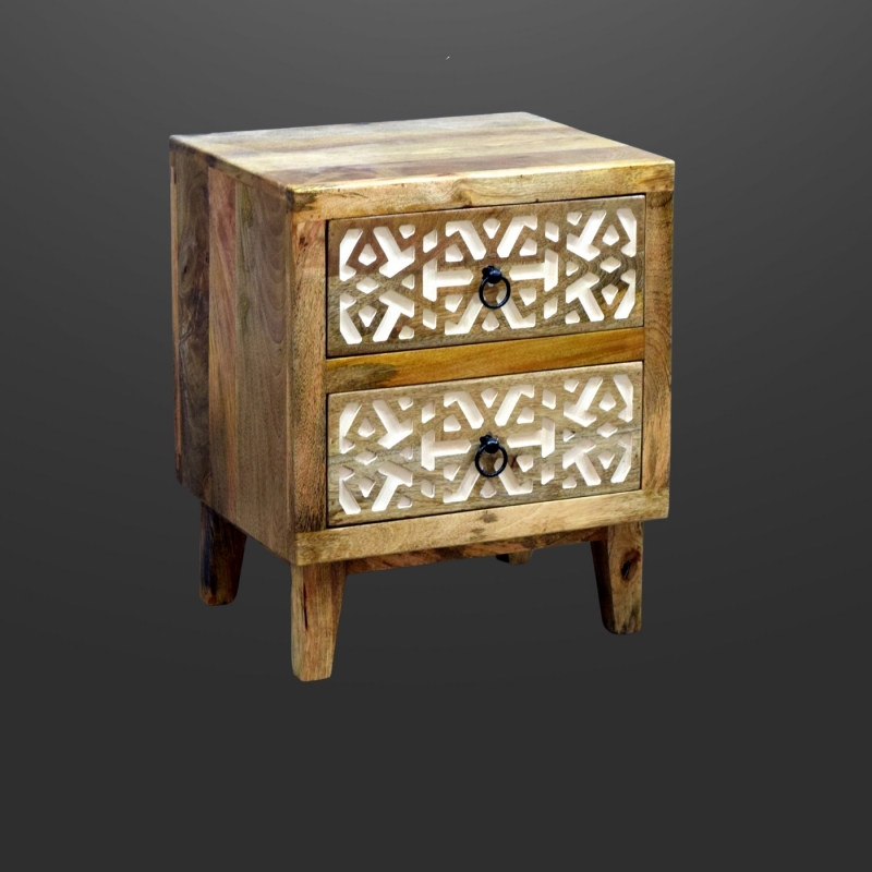 Elevate your space with this artisan-style bedside. Two intricately carved drawers offer beauty and storage in a compact, earthy design.