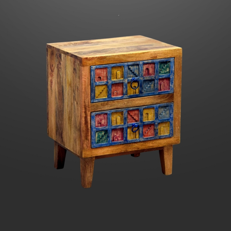 Brighten up any room with this vibrant and artistic hand-painted bedside table, featuring intricate carved patterns inspired by traditional Indian jharokha windows. Crafted from durable mango wood, it offers both charm and function with two spacious drawers ideal for storing essentials.