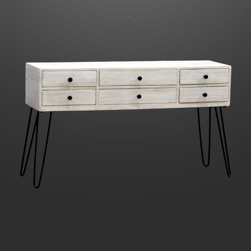 Mid-century modern console with 6 drawers and sleek hairpin legs—crafted in solid wood for stylish, compact storage in any living space.