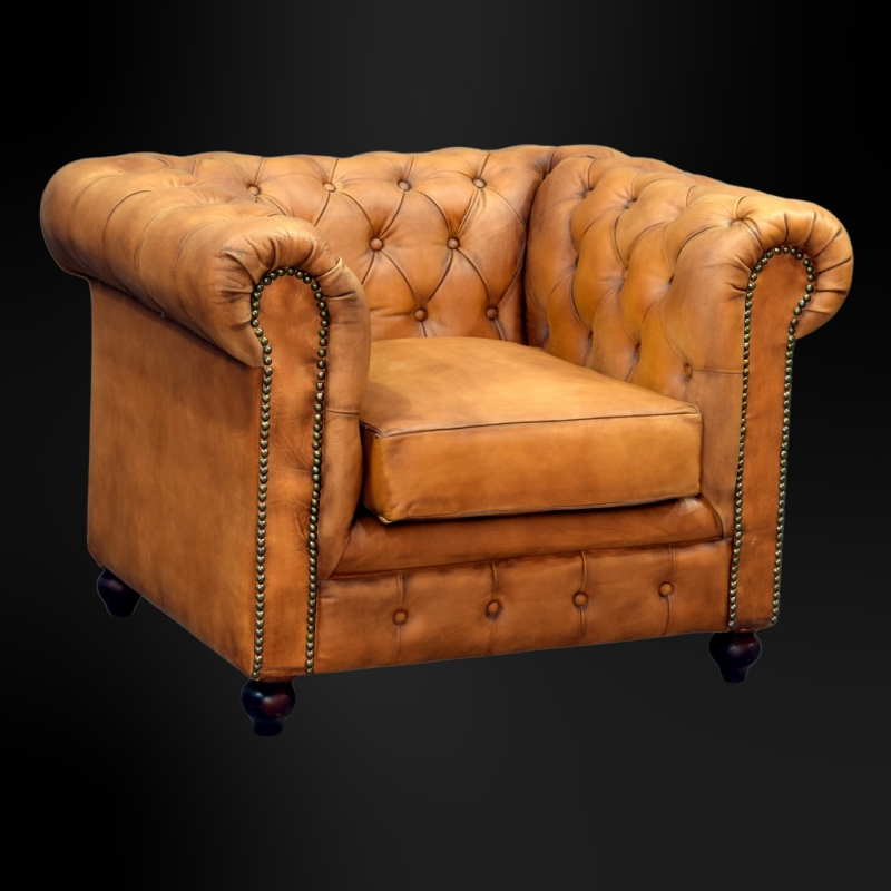 Add a touch of heritage charm to your living space with the KAP-7511 armchair, a beautifully crafted piece in warm-toned, full-grain goat leather. With its deep button tufting, generous rolled arms, and antique brass stud accents, this chair is a true statement of classic sophistication.