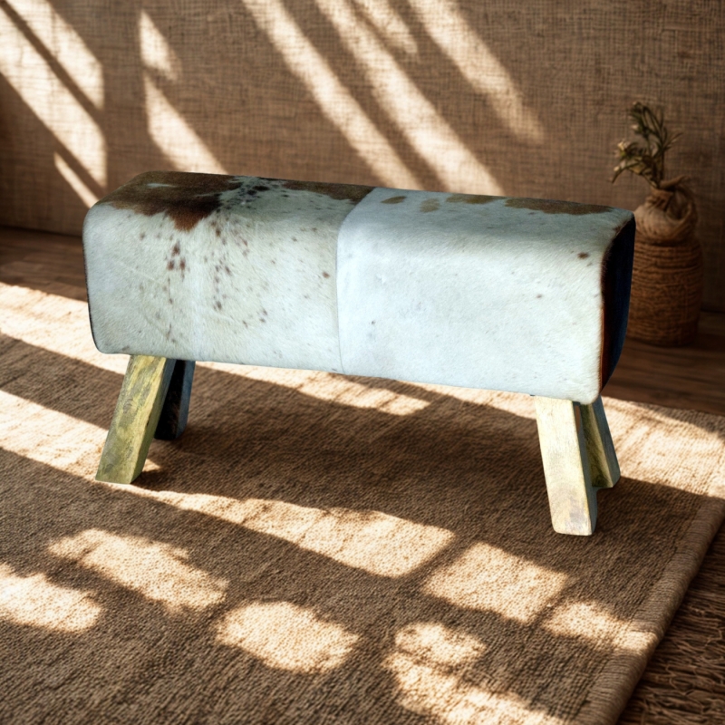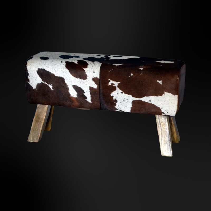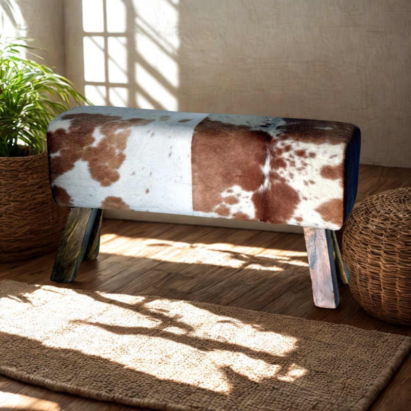 Measuring 86 x 30 x 48 cm (34 x 12 x 19 inches), the bench features a hand-upholstered seat in premium goat leather. Each piece showcases a unique natural hide pattern – a stunning combination of deep chocolate browns, blacks, and ivory tones – ensuring no two benches are ever alike.