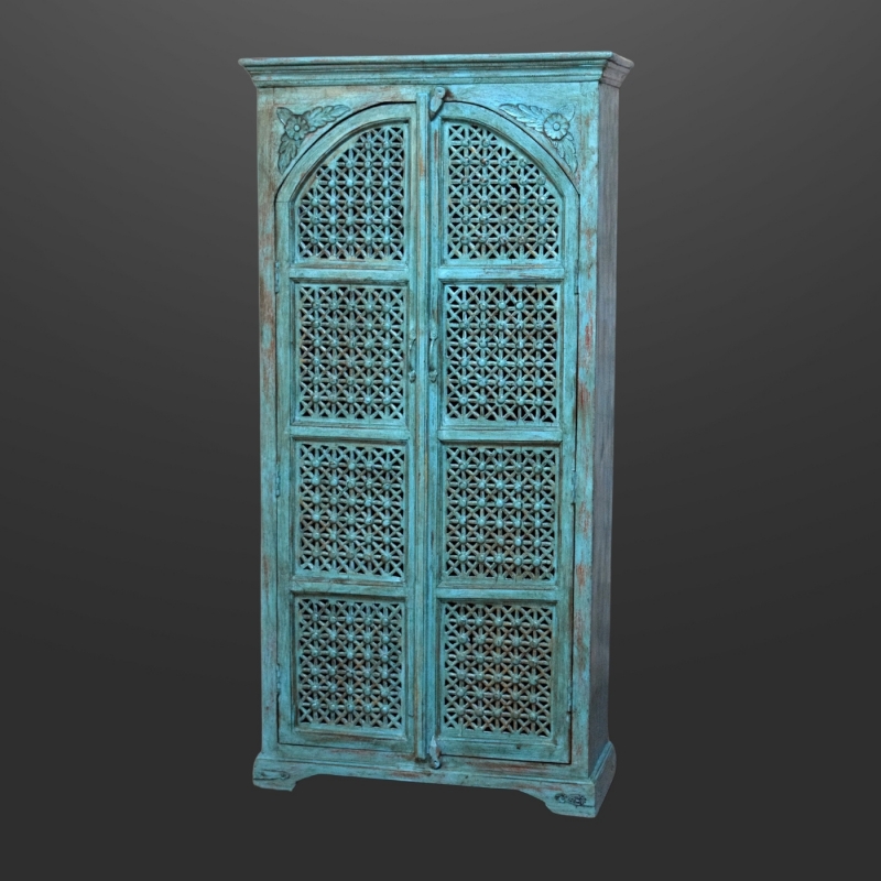 Make a bold statement with this handcrafted wooden cabinet featuring an intricate floral lattice design and a distressed antique blue finish. Perfect for adding vintage elegance and character to your living room, hallway, or bedroom.