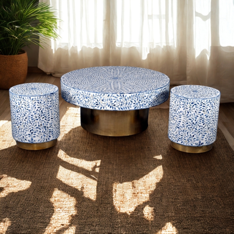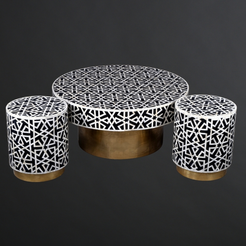 An exquisite ensemble that merges geometry with luxury, the KAP-8501 set includes a statement center table and two matching stools. Featuring bold black-and-white bone inlay in a modern geometric pattern, this set is elevated with a brushed brass-finish base—perfect for upscale interiors.