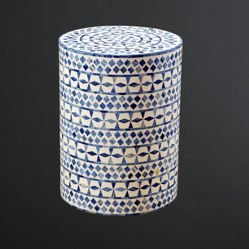 Bold geometry meets fine artistry in this handcrafted drum-shaped bone inlay stool. The KAP-8511 features a striking alternating pattern of blue and white motifs that wrap around its cylindrical form. The meticulously inlaid bone creates a rhythmic flow of pattern and texture, bringing modern elegance to traditional craftsmanship.