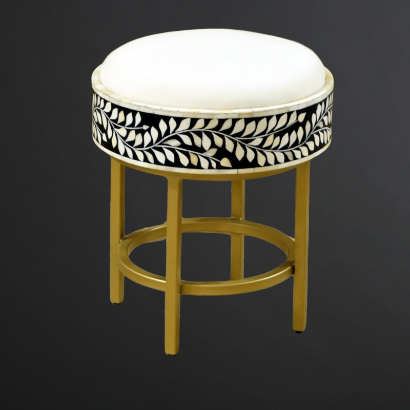 A refined blend of comfort and craftsmanship, the KAP-8520 stool features a soft upholstered seat atop a beautifully hand-inlaid floral vine pattern. Resting on a sleek golden metal base, this piece offers luxury in both style and function.