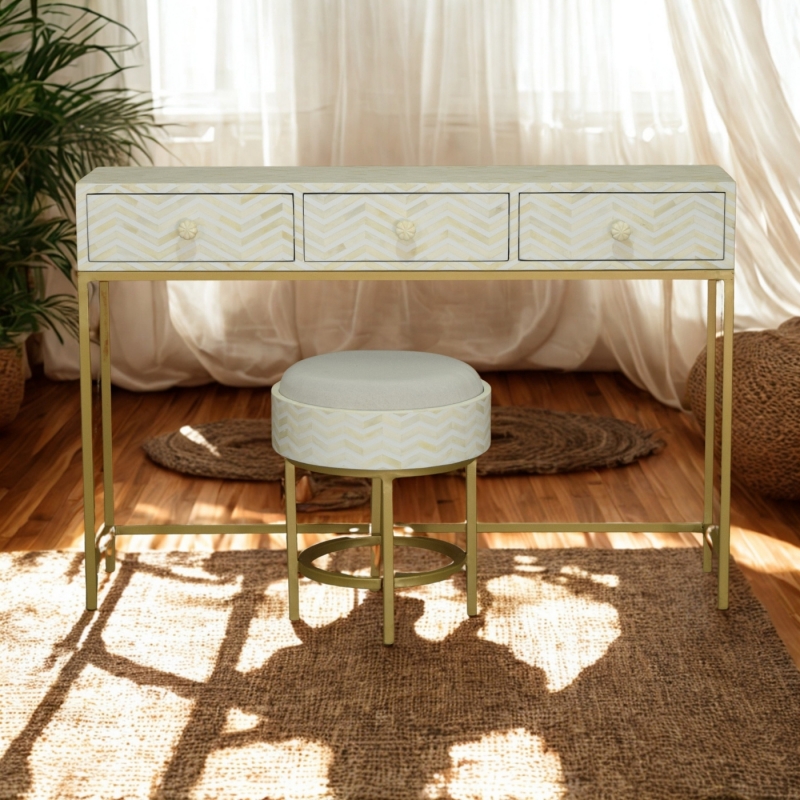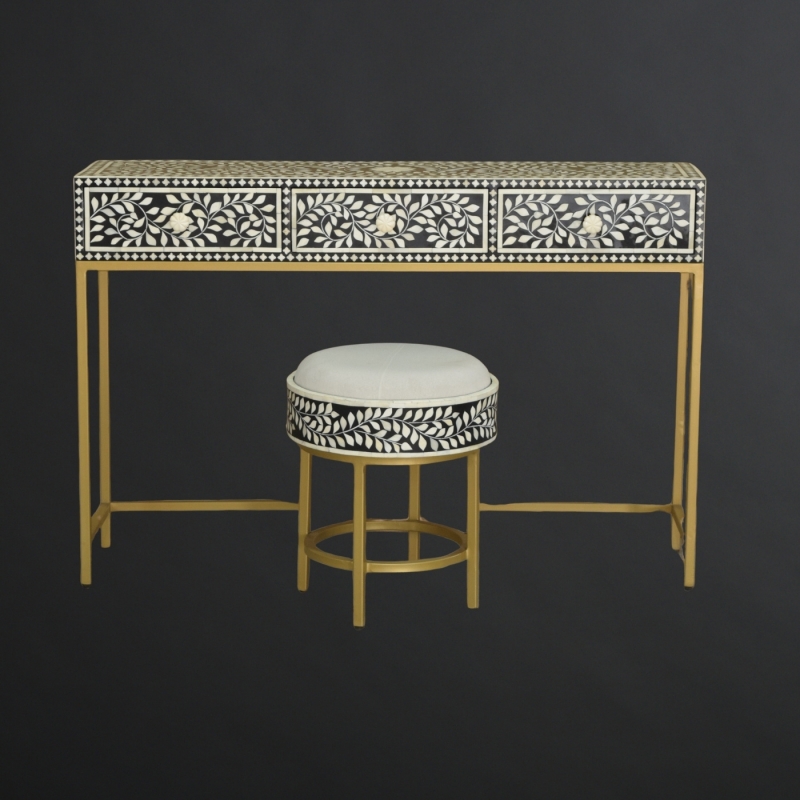 Make a striking style statement with this exquisite bone inlay vanity set, a perfect union of timeless craftsmanship and modern aesthetics. This handcrafted duo features a beautifully detailed three-drawer console and a matching cushioned stool, each adorned with intricate floral vine patterns made using ethically sourced bone inlay.