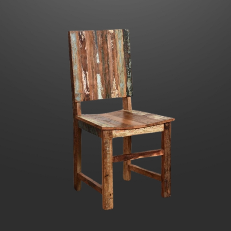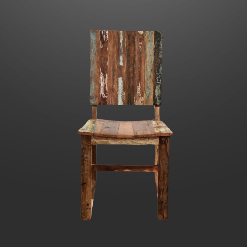 This sturdy, straight-back chair features a naturally weathered look with distressed textures and faded hues from its past life as boats, barns, or doors. Earthy tones, worn paint layers, and aged grain patterns blend to create a striking rustic design, rich in personality and artisanal appeal.
