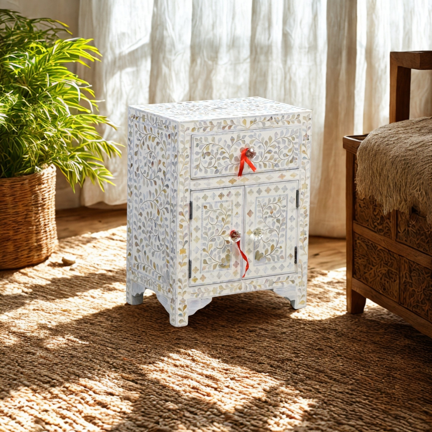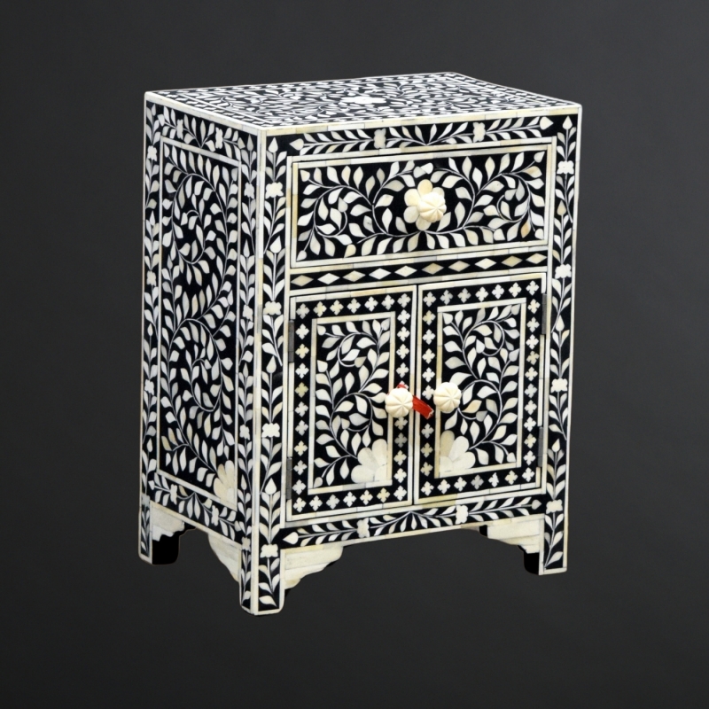The KAP-7782 is a timeless bedside cabinet adorned with intricate floral bone inlay detailing. Handcrafted with a delicate leafy vine pattern, it features one drawer and a double-door cabinet for practical storage. The floral bone knobs add charm and elegance, while the black background enhances the ornate ivory inlay. Ideal for bedrooms or as an accent piece, this cabinet is a perfect blend of traditional craftsmanship and modern utility.